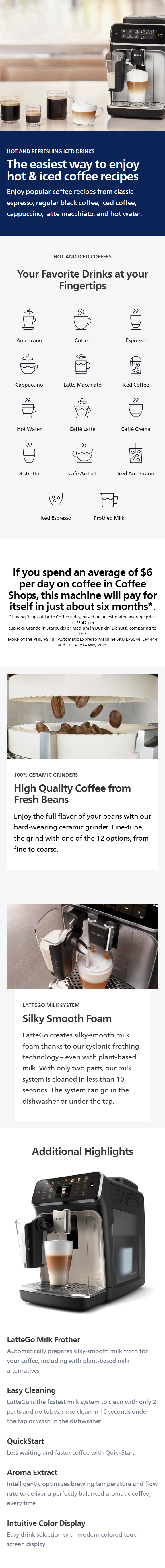 Enjoy café-quality coffee at home with the Philips 4400 Series, an automatic espresso machine with a built-in grinder that delivers true bean-to-cup coffee, ensuring fresh flavor in every sip. Choose from 12 customizable coffee recipes—from bold espressos to creamy lattes and refreshing iced coffees—each brewed at the perfect temperature with rich aroma and crema.This programmable coffee maker saves your favorite drinks with user profiles for a personalized experience, while the LatteGo milk frother creates silky smooth foam for perfect milk-based drinks and cleans up in seconds. Elevate your morning routine with barista-quality coffee at the touch of a button.
